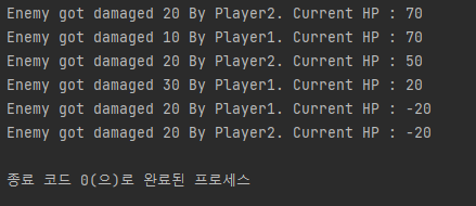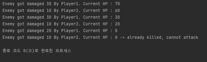 // enemy가 현재 받은 데미지, 데미지를 준 플레이어의 이름, enemy의 현재 남은 hp, enemy의 죽음을 알리는 상태를 출력함