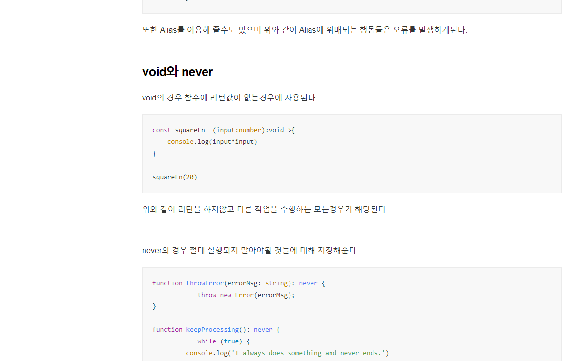 Call signature 콜시그니처란 어떠한 함수의 타입을 정의하는 것이다. const functionA = (arg1:number,arg2:number):void => { console.log(arg1,arg2) } 콜시그니처를 사용하지 않을경우 함수의 타입을 정할때 위와 같이 함수마다 정의해주어야된다. 만약 콜시그니처를 사용한다면 type callSignature = { (arg1: number, arg2: number): void; }; const functionA: callSignature = (ar1, ar2) => { console.log(ar1, ar2); }; 위의 코드처럼 객체의 타입을 정의하듯이 함수의 타입을 정의해준후 필요한 함수에 사용하기만 하면 된다. Overloading typ..